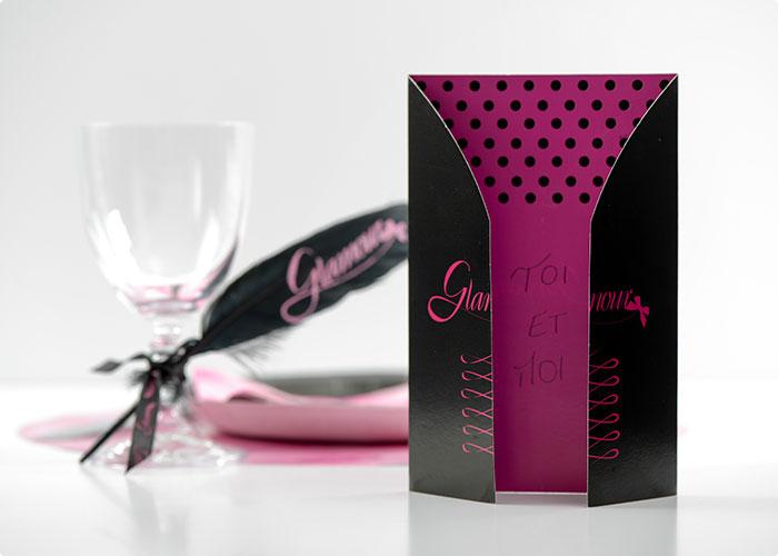 Pour votre prochaine soirée entre filles, voilà des cartons d'invitation qui sauront faire effet ! Ils mesurent env. 11 x 17 cm. Les cartons sont de couleurs rose et noir. L'intérieur comporte un emplacement blanc pour y inscrire le message souhaité. Ils ne vont pas sans rappeler la forme d'un corset.