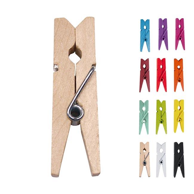 Les épingles sont livrées par lot de 12 et sont disponibles dans différents coloris : blanc, vert menthe, jaune, rouge, turquoise, vert, noir, orange, rose vif, lilas, bordeaux et naturel. Les épingles sont en bois et possèdent un ressort en métal.