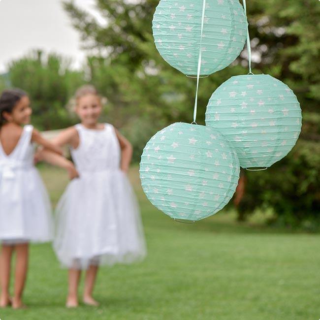 Les lampions "Petites étoiles" sont livrés par lot de deux et sont en papier. Ils se montent facilement à l'aide d'une armature en métal, qui vous permettra également de les accrocher facilement au plafond. Chaque lampion mesure env. 20 cm de diamètre et est disponible dans deux couleurs au choix : vert menthe ou saumon. Ils sont également tous recouverts de motifs blancs en forme d'étoiles.