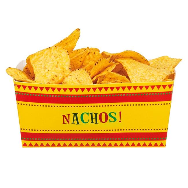 Servis avec du fromage fondu ou une sauce délicieuse? Claro ! Ces récipients sont vendus par 4 et sont faits en carton. Ils mesurent env. 8 x 7 x 15 cm. Ils sont jaunes, verts et rouges et portent l ´inscription "Nachos!".