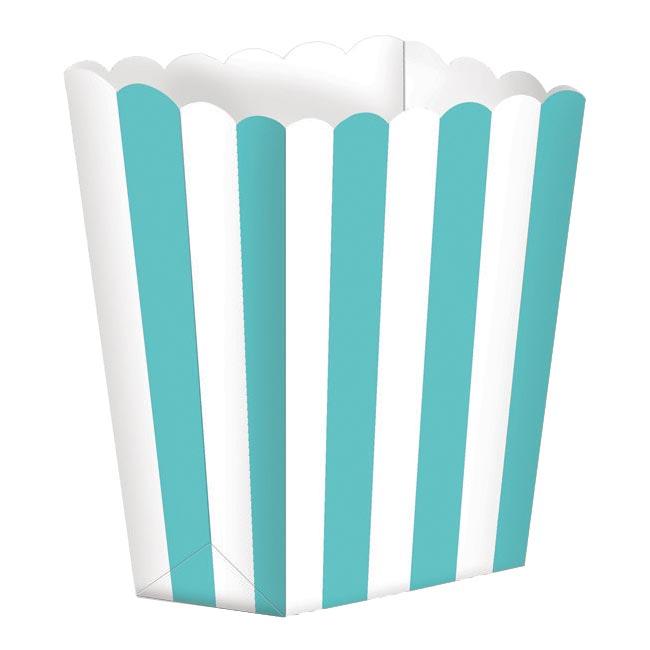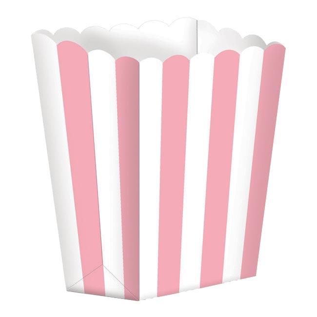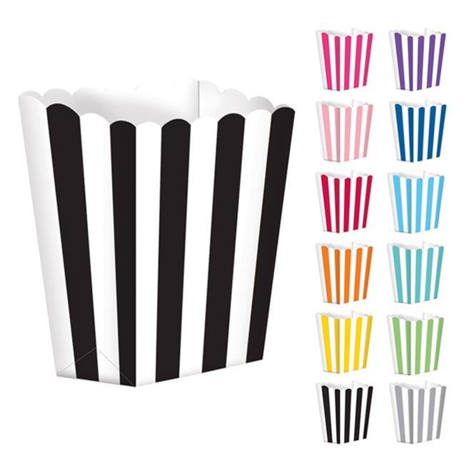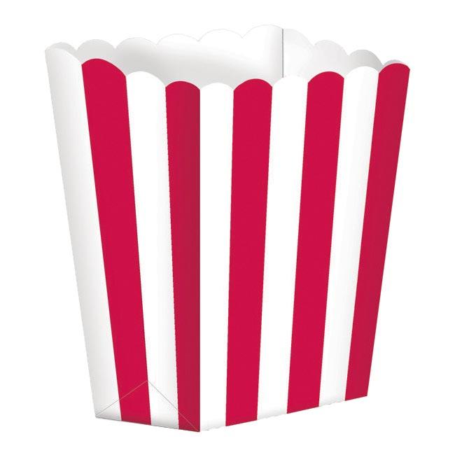 Les boîtes sont en carton et sont livrées par lot de cinq. Chaque boîte mesure env. 14 cm de haut pour une largeur d'env. 9,5 cm. Elles vous offriront une superbe déco de table mais seront aussi très pratiques et rétro ! À vous de les remplir à l'aide de pop-corn, bonbons ou encore chocolats !