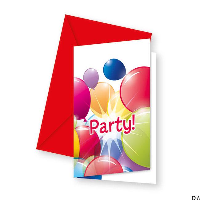 Accrochez les guirlandes, gonflez les ballons de baudruche et terminez la déco de table et la fête peut enfin commencer ! Mais n'oubliez pas les invités ! Ces cartes d'invitation sont livrées pat lot de six et mesurent environ 14 x 9 cm. Elles sont ornées de ballons multicolores et du mot "Party". Le lot comprend également six enveloppes assorties.
