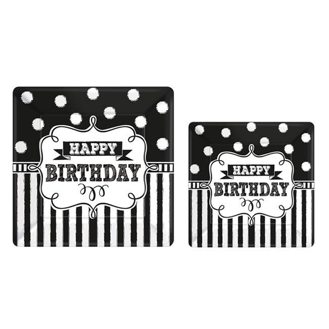 Les assiettes carrées en carton "Fête de la craie" sont livrées par lot de huit et disponibles dans deux tailles différentes au choix. Les petites assiettes mesurent env. 18,5 x 18,5 cm et les grandes env. 26 x 26 cm. Chaque assiette est carrée, de couleur noire et blanc et porte l'inscription "Happy Birthday".
