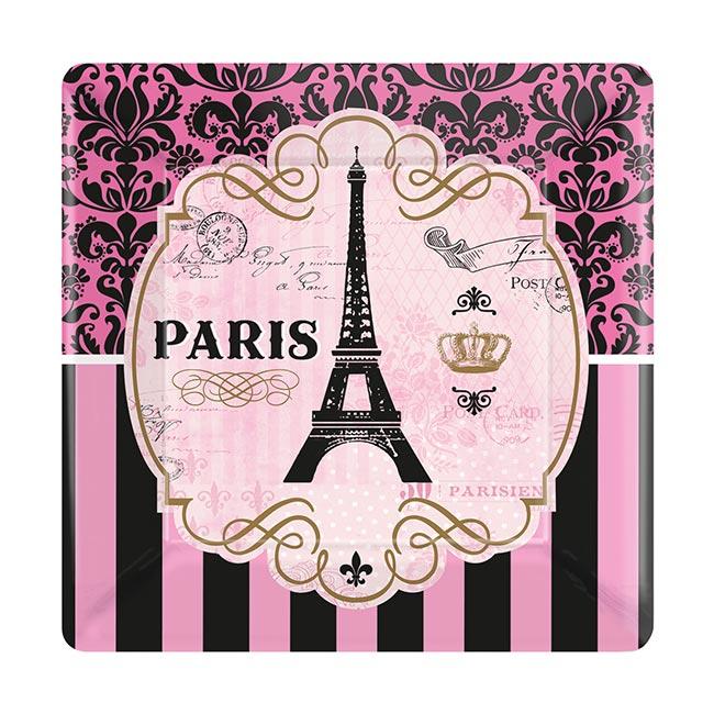 Les assiettes carrées en carton "La ville de l'amour" sont livrées par lot de huit et mesurent env. 26 x 26 cm. Au centre de chaque assiette se trouve une image de la Tour Eiffel, ainsi que plusieurs ornement de couleur dorée, noire et rose.