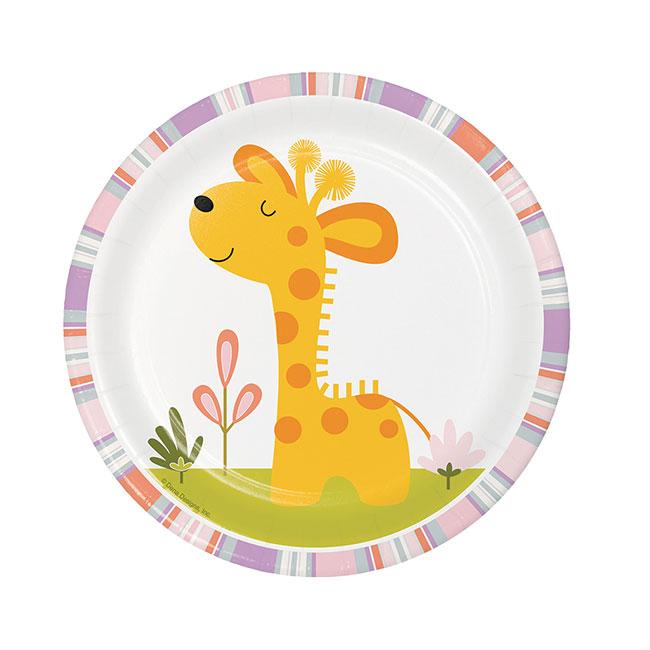 Les 8 petites assiettes en carton "Baby´s wild Jungle Party" possèdent un diamètre d´env. 17,7 cm. Le bord de l´assiette est décoré avec des rayures multicolores aux couleurs rose, violet, gris et orange. Le milieu représente une petite girafe.