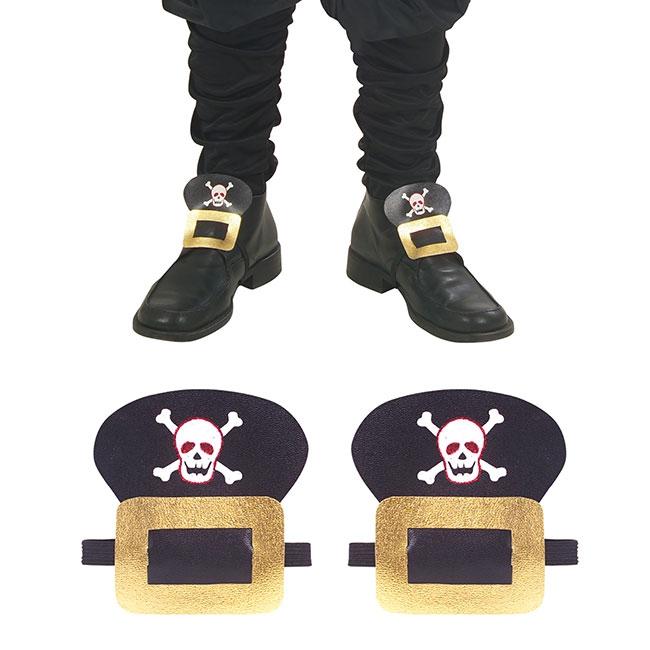 Les boucles de chaussures "Pirate" sont en plastique et la couleur dominante est le noir. Il y a également des éléments dorés ainsi qu'une tête de mort blanche avec des yeux rouges et des bordures écarlates. L'accessoire de style faux cuir se fixe à l'aide d'une bande élastique sur la chaussure.