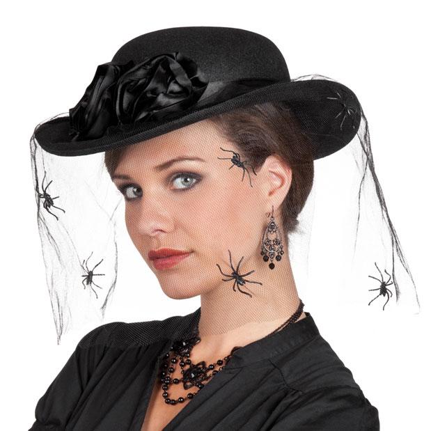 Êtes-vous à la recherche d'un accessoire chic et choc pour votre prochaine soirée déguisée ? Avec ce chapeau, vous deviendrez littéralement la "Veuve noire"! Ce chapeau noir est orné d'un ruban et d'un voile noir orné de petites araignées. Vous trouverez beaucoup d'autres articles sur notre boutique en ligne pour compléter votre costume !
