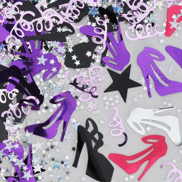 Dans le sachet de confettis "Ladies Night", vous trouverez sept motifs différents. Des escarpins roses, violets ou noirs, des serpentins roses et des étoiles noires et argentées. Tous les confettis sont composés d'une feuille métallisée brillante. Idéales pour une soirée entre filles, ces décorations conviendront à un enterrement de vie de jeune fille par exemple !