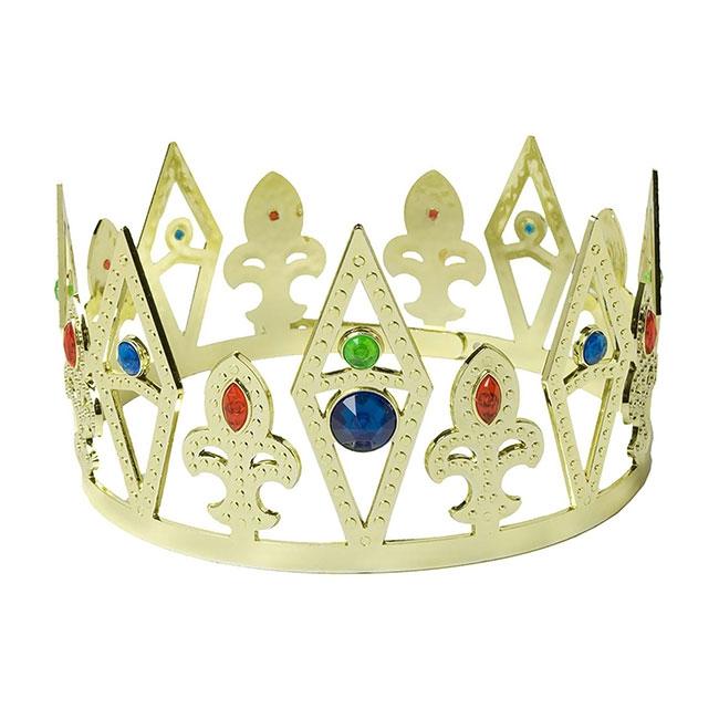 La couronne du roi est composée en plastique et est de couleur dorée. Chaque pique porte des diamants en plastique de différentes couleurs (vert, bleu et rouge). La couronne déroulée mesure env. 65 cm et sa taille peut être reglée.