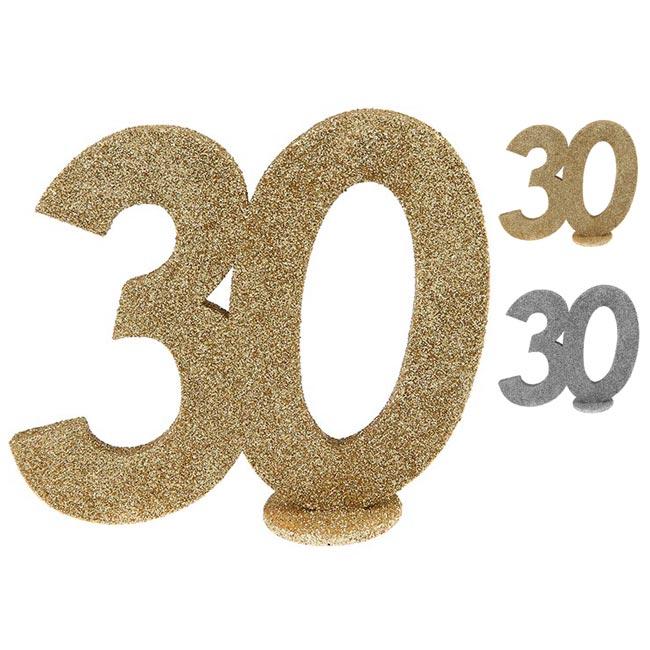La déco de table "30 & paillettes" mesure env. 10 x 10 cm. Elle est en plastique et recouverte de paillettes. À vous de choisir entre la couleur dorée et la couleur argentée.