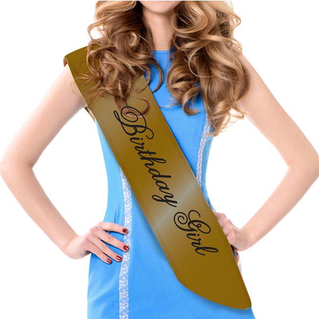 L'écharpe "Birthday Girl" est en tissu polyester et mesure env. 83 x 10 cm. Elle est de couleur dorée et porte l'inscription "Birthday Girl" de couleur noire.