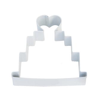 L'emporte-pièce est en métal revêtu et mesure env. 10 cm. Il est en forme de pièce montée, sur laquelle se trouve un coeur.