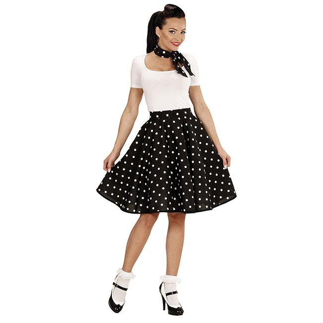 Cet ensemble sera parfait pour la prochaine soirée sur le thème des années 50 ! Vous retrouverez une jupe ainsi que le foulard de la même couleur. La jupe mesure env. 60 cm de long et est disponible en taille unique. Elle se ferme à l'aide de deux boutons (vous disposez de deux trous différents, vous permettant de régler la taille de la jupe). L'ensemble est à 100% en polyester.