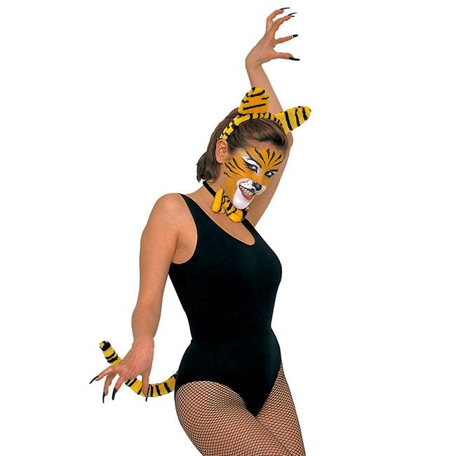 Cet ensemble comporte 3 pièces : un serre-tête d'oreilles de tigre, un collier avec un noeud papillon et une queue. Le serre-tête est composé en peluche recouvert d'un motif de tigre, de même pour le noeud-papillon. La queue s'attache à votre tenue à l'aide d'une épingle à nourrice.