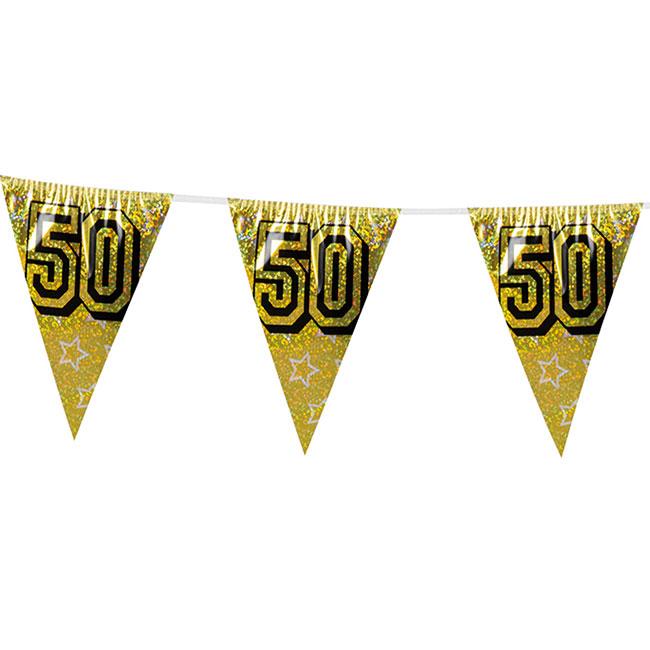 La guirlande de fanions "50 & doré" mesure env. 8 mètres de long et est en plastique. Chaque fanion mesure env. 22 cm de large pour une hauteur d'env. 28 cm. Le recto de chaque fanion est de couleur doré et holographique avec des étoiles argentées et le chiffre 50 de couleur noire. Le verso est argenté et holographique.