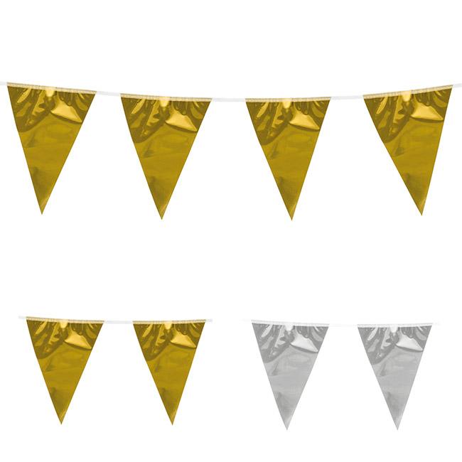 La guirlande de fanions "Fête glamour" est en plastique et mesure env. 10 mètres de long. À vous de choisir parmi les deux coloris au choix : doré ou argenté. Chaque fanion mesure env. 19,5 cm de large pour une hauteur d'env. 31 cm.