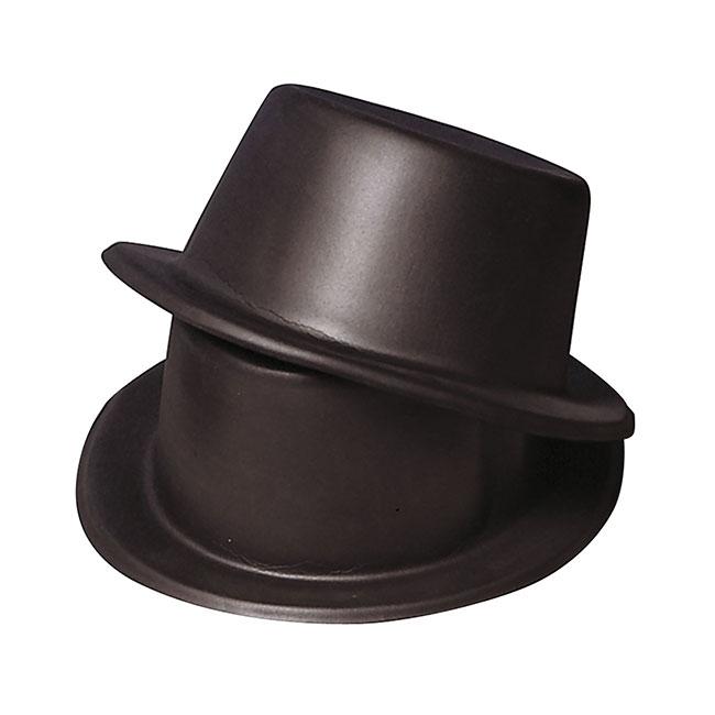 Le chapeau haut-de-forme noir est composé d'un plastique mat très doux au toucher. Le chapeau mesure environ 10 cm de haut et le diamètre est de 16 cm.