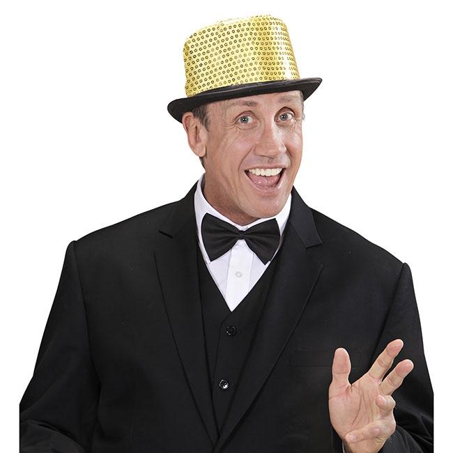 Ce haut-de-forme est en polyester et recouvert de paillettes. Il est disponible dans différentes couleurs au choix : doré, argenté, noir ou rouge. Quelque soit la couleur, le bord du haut-de-forme reste cependant toujours noir.
