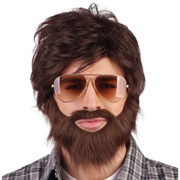 La perruque est composée de cheveux synthétiques de couleur orange ou marron au choix. Elle est livrée en taille unique. La barbe fournie avec cette perruque tiendra à l'aide de deux petits élastiques passés derrière les oreilles. Les lunettes de soleil ne sont pas fournies avec l'ensemble.