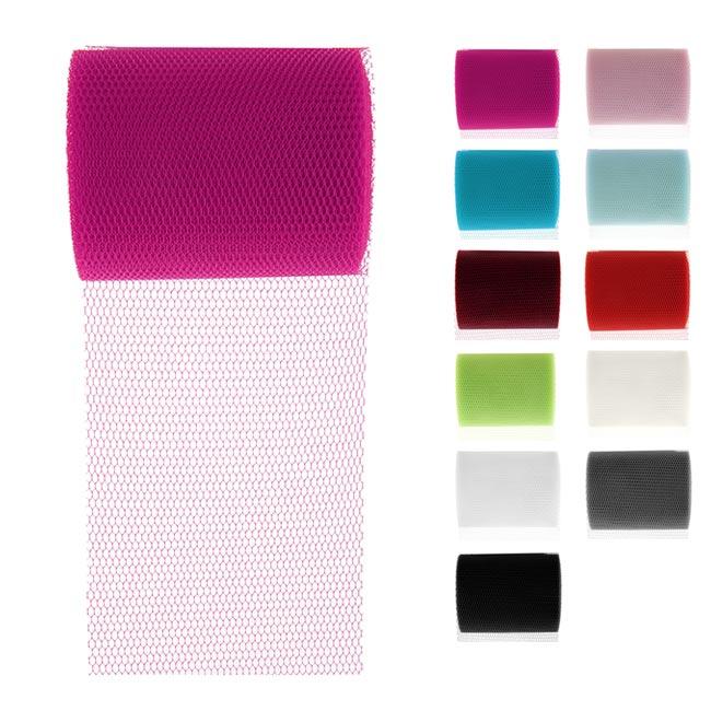 Le ruban en tulle est unicolore et disponible dans 11 coloris au choix : blanc, gris, rose, rose vif, bleu clair, rouge, turquoise, vert, noir, bordeaux et ivoire. Le ruban en tulle mesure en tout environ 10 m de long pour une largeur d'env. 8 cm.