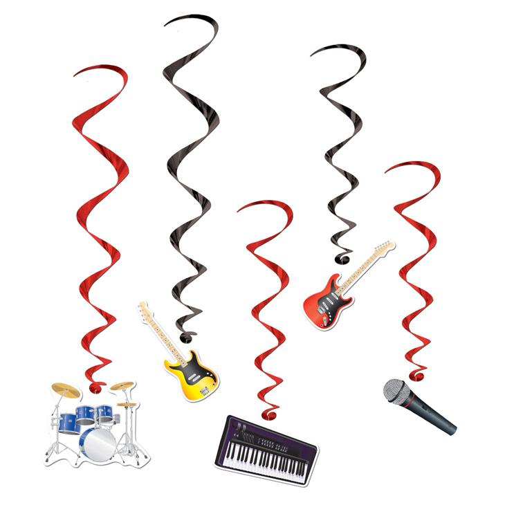 Une soirée années 80 ou rock star en perspective ? Ces suspensions à spirales mesurent environ 102 cm de long et rappellent la belle époque de la célèbre chanson "Major Tom". Les décos sont ornées de motifs en carton : 1 clavier, 1 micro, 1 guitare rouge, 1 guitare jaune. Les motifs sont accrochés à des suspensions de lamelles noires ou rouges.